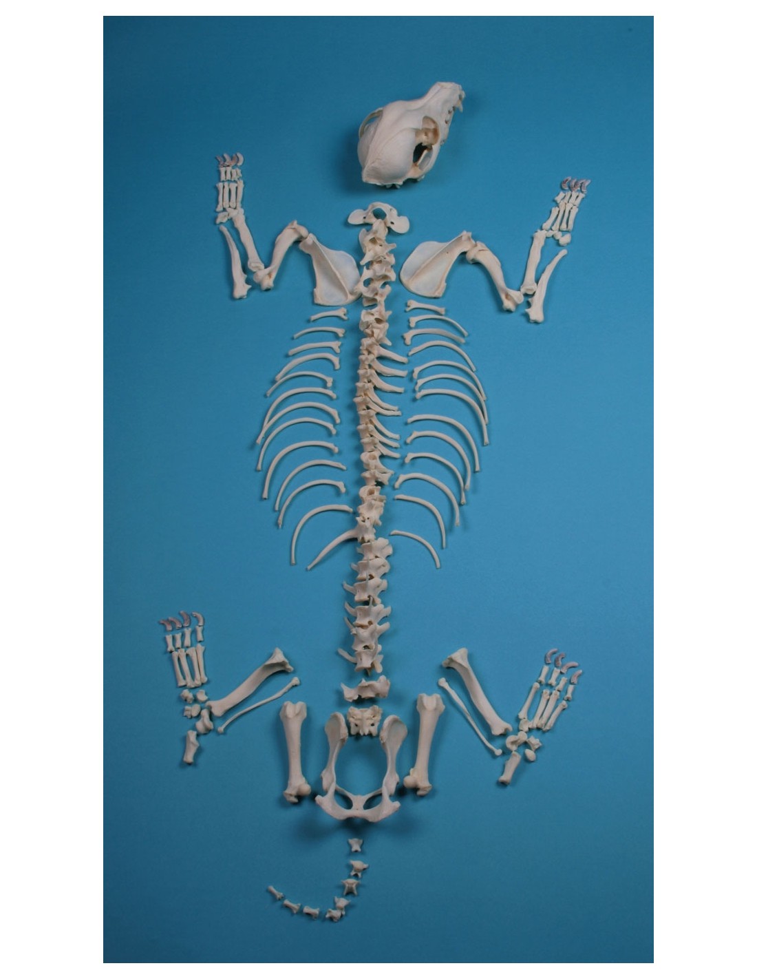 Este esqueleto é feito de ossos reais de um cão pequeno.