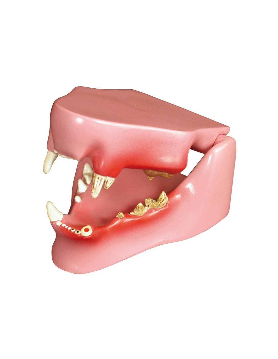 As oito patologias presentes são: canino fracturado, doença periodontal, acumulação de tártaro, placa bacteriana, gengivite, incisivos desgastados, dente decíduo retido e pré-molar em falta. A mandíbula pode ser aberta, fechada e separada para um exame mais aprofundado.